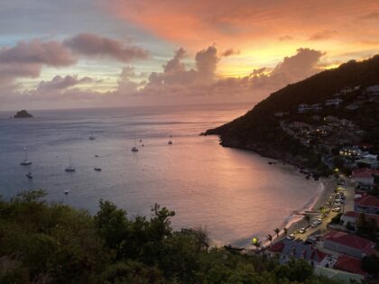 The sun dipping over Corossol Bay, painting sky and sea in gold and rose tones as ocean vistas stretch toward Gustavia.
