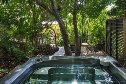 A jacuzzi tucked into the tropical garden adds an extra layer of relaxation and privacy.