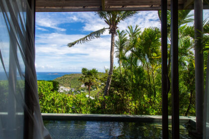 Bedroom 1, view from the bed to the private plunge pool, and lush vegetation