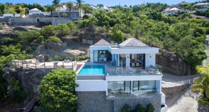 Villa Star perches on the hillside in Camaruche, gazing over Lorient Bay with a long pool that seems to drip into the ocean, framed by dramatic terraces and floor-to-ceiling glass walls.
